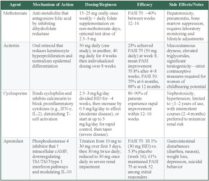 Acitretin, an oral retinoid, primarily exerts its effect by reducing keratinocyte hyperproliferation and promoting normalization of epidermal differentiation; its precise mechanism, however, is not completely understood.51 This agent appears to be especially beneficial in pustular and erythrodermic forms of psoriasis, though it may not show as much efficacy compared with other systemic medications.48 During clinical trials, various dosing regimens of acitretin have demonstrated considerable improvements: one study reported that 23% of patients receiving 50 mg daily reached a 75% improvement in PASI scores by week 8, while another trial showed a mean PASI improvement of 75.8% following an initial 4-week course of 40 mg daily followed by individualized dosing over an additional 8 weeks.52,53 Moreover, maintenance therapy yielded a 50 % reduction in PASI score in 75% of patients at 6 months and 88% at 12 months48 Acitretin utilization is restricted by an adverse effect profile, which includes mucocutaneous dryness, elevated triglyceride levels, and significant teratogenic risks that necessitate strict contraceptive measures for women of childbearing potential.51