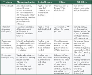 Selecting the most appropriate topical treatment requires diligent consideration of factors including severity, location, and duration of usage. Corticosteroids are the most accessible first-line therapy, with up to 92% clearance rates but risk adverse side effects with prolonged use, especially on sensitive areas.25 Vitamin D analogs achieve 70% efficacy for body lesions and may be better for milder cases of plaque psoriasis.25 Calcineurin inhibitors are preferred for facial and intertriginous areas despite higher cost and FDA warnings.25 Salicylic acid serves as a treatment to primarily target cases of psoriasis with thick plaque.26