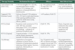 Based on these phototherapy modalities, selection depends on disease extent, lesion characteristics, and safety considerations. NB-UVB is the most commonly used option for generalized plaque psoriasis, achieving 62% to 70% PASI 75 response with minimal adverse effects, making it the safest long-term phototherapy choice.56,57 Targeted UVB provides precision treatment for localized areas such as the scalp, elbows, or palms, achieving 61% PASI 75 response with benefits of faster clearing and reduced overall UV exposure to unaffected skin.55 PUVA therapy offers the highest efficacy (73%-77% PASI 75) for thicker, resistant plaques, but prolonged use risks burns and increased nonmelanoma skin cancer risk, particularly squamous cell carcinoma, limiting long-term use.56,58 Treatment selection prioritizes NB-UVB for generalized disease and long-term safety, targeted UVB for localized lesions requiring precision, and PUVA for resistant plaques when higher efficacy outweighs cancer risks.