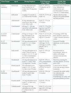 Selecting the most appropriate biologic therapy for patients with moderate to severe psoriasis requires careful consideration of several patient-specific factors. Insurance coverage and cost play significant roles, as biologic treatments can be costly. TNF-α inhibitors can cost more than $30 000 annually, potentially limiting accessibility based on insurance plans.46 Concurrent medical conditions should also guide the selection; IL-17 inhibitors, for example, should be avoided in patients with active inflammatory bowel disease due to potential exacerbation.35 Conversely, infliximab (a TNF-α inhibitor) may benefit patients presenting with plaque-type palmoplantar or nail psoriasis.35 Contraindications must also be evaluated carefully; TNF-α inhibitors are contraindicated in patients with moderate to severe heart failure due to adverse cardiac remodeling effects.39 Additionally, patient adherence and preferences regarding injection frequency must be assessed. Agents such as ustekinumab offer a convenient dosing schedule every 12 weeks after initial loading doses, whereas others such as etanercept or certolizumab require more frequent administration.35,43 Last, potential adverse events—including increased infection risk with TNF-α and IL-17 inhibitors, Candida infections specifically with IL-17 inhibitors, and rare psychiatric events with brodalumab—should be considered and monitored appropriately.35,45