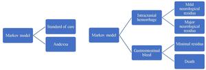 Our team designed a Markov model to compare 2 treatment strategies for the care of ICH and GIB in patients taking apixaban or rivaroxaban. The 2 modes of treatment we assessed included the current standard of care using combined infusion of Feiba (a type of aPCC) and Kcentra (a type of PCC) vs the administration of Andexxa at the time of the bleeding event diagnosis.